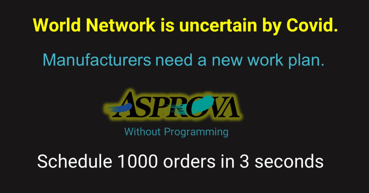 Unpredictable changes and problems are occurring in world network by Covid. You need a new work plan. With Asprova, you can schedule 1000 orders in 3 seconds.